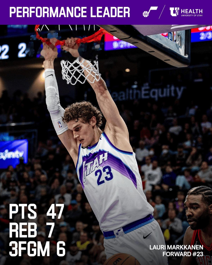 全场比赛,爵士前锋劳里-马尔卡宁首发出战46分钟,33投15中,三分球17投6中,罚球13罚11中得到47分7篮板2助攻2抢断2封盖。